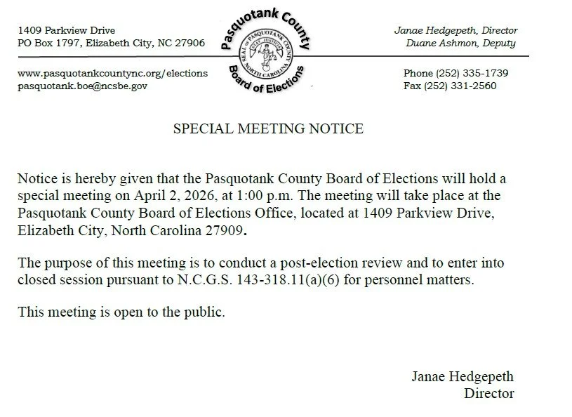 The Board of Elections is responsible for conducting all elections in Pasquotank County, including federal, state, county and municipal elections, and special referenda. The elections office is dedicated to providing fair, honest and impartial elections to the citizens of Pasquotank County and Elizabeth City.