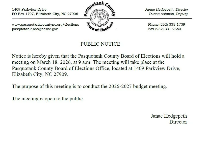 ATTENTION VOTERS: PLEASE CLICK ON THE BELOW HYPERLINK FOR MORE INFORMATION REGARDNG THE LETTER YOU MAY HAVE RECEIVED FROM THE PASQUOPTANK COUNTY BOARD OF ELECTIONS, VIA THE NC STATE BOARD OF ELECTIONS