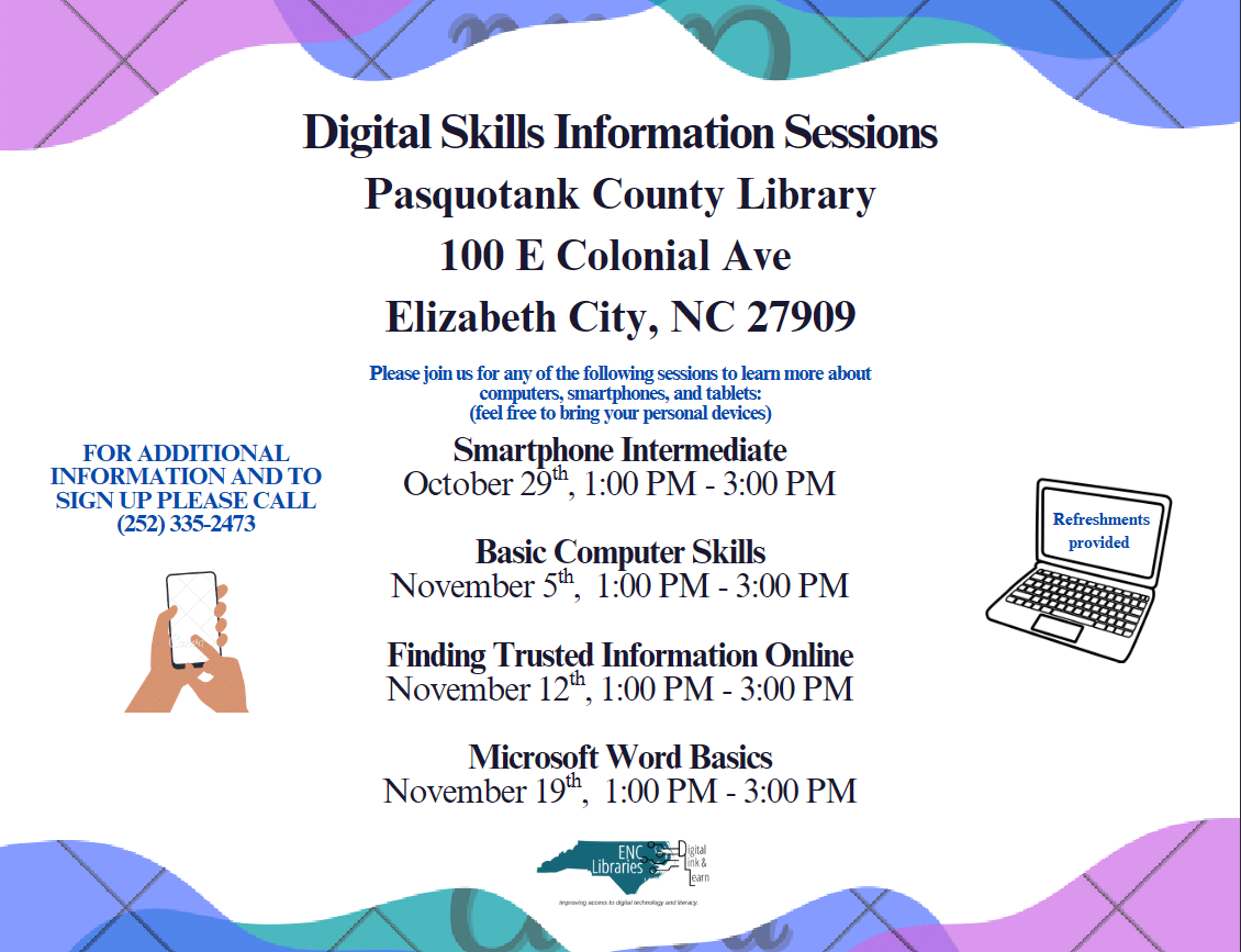 Here are the current events at the Library. If you have any questions about an event, call the library at 252-335-2473.